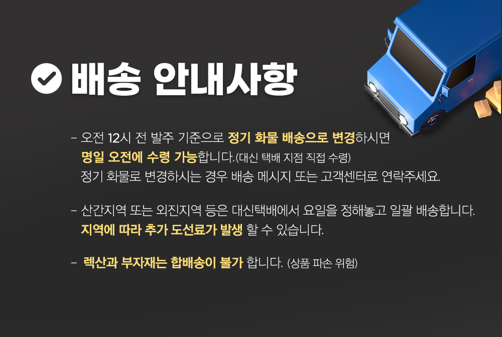 - 상품 하자, 오배송의 경우 수령일로부터 7일 이내 고객센터 접수 후 교환∙반품이 가능합니다. (교환/반품비 무료)